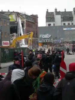 Demolition of Ungdomshuset began at 8 am on 5 March 2007.[2][3] A demolition crane started its work at the back of the house with the top floor. The logos on the crane were covered and workers wore masks to conceal their identity. The union representing Ungdomshuset was on the ground trying to persuade the workers to stop working and reveal the company they were working for. At 10 am the Danish Working Environment Authority (Arbejdstilsynet) had the demolition interrupted due to reported concerns about dust and the potential presence of asbestos. The demolition resumed at 11 am. At 4 pm, about one-third of the house had been removed. The demolition was broadcast live by webcam on TV2 News' website.[2]
