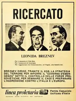 *For the kidnapping of Aldo Moro *for the assassination of Casalegno *for the aggressions against Czechoslovakia, Angola, Somalia, etc. Brezhnev leads, through KGB, the strategy of terror to impose the 'emergency government' under control of pro-Soviet forces, to spread chaos and to prepare aggression against Italy and Europe."