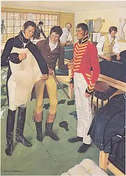 The design of early army uniforms was influenced by both British and French traditions. One of the first Army-wide regulations, adopted in 1789, prescribed blue coats with colored facings to identify a unit's region of origin: New England units wore white facings, southern units wore blue facings, and units from Mid-Atlantic states wore red facings.[1] Bandsmen wore red uniforms to make them more easily identifiable to commanders on the field of battle. Pantaloons were originally white, following British uniforms, but were changed to gray in 1821 and sky blue in 1832. Infantry wore tricorne hats, with different cover prescribed for cavalry and specialist troops depending on function.