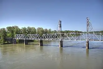 The bridge has two towers that rise an additional 65 feet (20 m) above the 35-foot (11 m) tall structure of the bridge's trusses, a 134-foot-long (41 m) center lift span, and a total length of 722 feet (220 m), excluding the 850-foot (260 m) timber trestle on the western end. The bridge's five spans sit atop five concrete piers designed to rise 35 feet (11 m) above mean low water, which was intended to hold the rails 5 feet (1.5 m) above the highest possible flood waters. The lift span was designed to provide a 55-foot (17 m) clearance during high water conditions. The lift span has been inoperable since 1980, and sometime after 1980 the operator's house – which sat atop the lift span – was removed.[2]