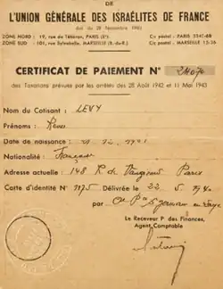 - ^ "L'Union générale des Israélites de France (UGIF)" (PDF). Akadem (in French). Fonds Social Juif unifié, Holocaust Memorial Foundation. Retrieved 14 January 2021.