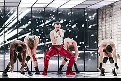 Olly Alexander took part in technical rehearsals on 2 and 4 May, followed by dress rehearsals on 10 and 11 May.[43] The theme of his performance of "Dizzy" at the contest is set around a "post-apocalyptic dystopian boxing gym locker room, aboard a spaceship hurtling toward Earth through a black hole in 1985", with four male backing dancers and the singer himself dressed in red boxing gear.[44]