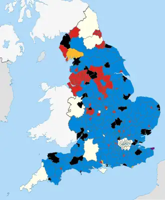 ![]() The results in England. White areas indicate elections were not held here in 2015. | |||||||||||||||||||||||||||||||||||||||||||||||||||||||||||||||||
