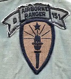 In 1967 the Indiana National Guard formed two Long Range Patrol Companies[45][46] followed by the Michigan National Guard in 1968[47][48] using leftover personnel from National Guard Airborne Infantry Battalions.[49][50] Under the Combat Arms Regimental System (CARS) order of 1969, all LRP/LRRP were redesignated Ranger Companies[51] through TO&E 7-157[52] (E, G, and later H),[53] active component Ranger Companies were consolidated into 75th Infantry Regiment,[54] while the only change in National Guard designations[55] were from LRP to Ranger.[56] Three more National guard Ranger Companies were later formed[57] along with unit consolidations in Indiana[58][59] and Michigan.[48] Overall there were eight companies spanning their twenty-year history. There were a total of seven National Guard Ranger companies during the Vietnam conflict but not more than five during any given time. Co D (Ranger) 151st Infantry was the only reserve component Infantry unit to see combat in Vietnam[60][61] and emerged as one of the most decorated Infantry companies throughout the war.[62][63][64] At close of the Vietnam conflict, the Abrams Charter reorganized the Active Component Ranger Companies into Ranger Battalions while only three independent Ranger Companies remained throughout the US Army's arsenal and resided solely in the National Guard using Vietnam era TO&E 7-157.[48][56][65] In the late 1970s the number shrunk to two companies after deactivation of the famed D co (Ranger) 151st Infantry.[66][67] Upon the Deactivation of Texas National Guard's 36th Airborne Infantry Brigade,[49] the TO&E 7-157 and Ranger designation from a Company in Puerto Rico National Guard was transferred to an Airborne Infantry Company in Texas.[68][69] During much of the 1980s the National Guard's only two Ranger Companies were F co (Ranger) 425th Infantry and G co (Ranger) 143rd Infantry.[70][71][72][73] These two ranger units were aligned with I Corps and III Corps respectively while continuing to follow TO&E 7-157[74] during training with foreign special operations units[75][48] and while participating in large scale NATO exercises in Europe.[76][77] During this time the Active Component were also separately developing the Long Range Surveillance (LRS) doctrine through Provisional companies in the 1st Infantry Division, 9th Infantry Division, and 82nd Airborne Division. In 1984 the Army adopted LRS doctrine and in 1985 the Active component and National Guard began forming a LRS detachment (LRSD) for every maneuver Division and a LRS company (LRSC) for every Corps, essentially stripping the ranger designations from the last two National Guard companies. In 1987 F/425 continued with I Corps, G/143 with III Corps, both as LRSCs,[56][78][48][79] and D/151 returned as Trp F 1st 238 Cavalry (LRSU).[80] In 2016 the 151st LRSD, the final National Guard LRSU with Ranger lineage, was redesignated into a light infantry company,[81] ending the final chapter on National Guard Ranger/LRRP Companies and their unique legacy.