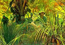 In Vietnam LRRP platoons and companies were attached to every brigade and division where they perfected the art of long-range patrolling.[28] Since satellite communications were a thing of the future, one of the most daring long-range penetration operations of the Vietnam War was launched on 19 April 1968, by members of the 1st Air Cavalry Division's, Company E, 52nd Infantry (LRP), (redesignated Co. H, Ranger), against the NVA when they seized "Signal Hill" the name attributed to the peak of Dong Re Lao Mountain, a densely forested 4,879-foot (1,487 m) mountain, midway in A Shau Valley, so the 1st and 3rd Brigades, slugging it out hidden deep behind the towering wall of mountains, could communicate with Camp Evans near the coast or with approaching aircraft.[30]
