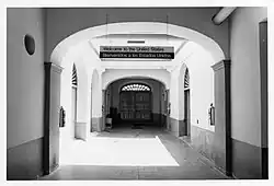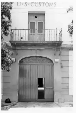 The facades are similar with regular door and window openings and with small balconies to the second-floor openings. There is a small partial false gable roof of Spanish barrel red-clay tiles around the four sides and around the courtyard. On the front (south) facade, facing the ocean, there are five bays with a large elliptical arch-headed passageway large enough for vehicular traffic. It is architecturally marked only by a plain, flat frame painted differently from the body of the building. There are plain board, double doors with a smaller pedestrian port in the right door. In the elliptical arch there is a simple fanlight window. Flanking the arched entrance are two large high windows on each side. The windows are two-leaf casements with exterior solid and louvered combination paneled shutters. Metal grilles are at each window. The walls have a simple low projecting base course, and the first floor walls are marked by horizontal incised coursing, all in stucco. There is a large molded string course between stories and on the second floor, five door openings, each with double-leaf doors that are half sash, which replaced the original louvered and paneled shutter combinations. Over the doors are sashed transoms, although the right group has been replaced by air conditioners. Each opening has a decorative wrought iron balcony with scroll support dating from the U.S. remodeling of the building. Previous to these wrought-iron balconies, the building had cast iron railings. "U.S. Customs" is lettered over the central window. At the top is a large double masonry molded cornice, surmounted by the small false partial gable in Spanish tiles, both from 1924. On the front only, there are three flag poles on the roof, and a large antenna system. On each side of the first floor passage entry is an alarm box and a plain light fixture.[9]