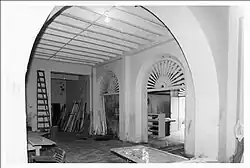 On the second floor, the staircase from the entry passage opens on a large lobby from a two-arched staircase arcade. The lobby extends from the front back to the courtyard and is floored with diagonally laid gray and white marble tiles. The walls, as are old walls in the building, are plastered, and the ceiling has exposed 4x10 beaded ausubo wood beams. Old double four-paneled doors and a transom open to the courtyard. The window in the stairhall has been filled in with glass brick.[11]