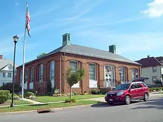 US Post Office—Akron is a historic post office building located at Akron, Erie County, New York. It was designed and built 1939–1940, and is one of a number of post offices in New York State designed by the Office of the Supervising Architect of the Treasury Department, Louis A. Simon. It was completed in December 1940 as the result of residents requesting it from Congressman Alfred Beiter.[2] The building is in the Colonial Revival style and is virtually identical to the post offices at Scotia, Oxford, Middleburgh, and Horseheads. The interior features a mural by Elizabeth Logan painted in 1941 and titled Horse-Drawn Railroad.[3]
