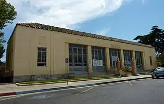 The U.S. Post Office, located at 65 W. Mill Ave., is the main post office in Porterville, California. Built from 1933 to 1937, the post office was designed by H. Rafael Lake in the Art Deco style. The design features decorative terra cotta plaques over the windows and cast aluminum plaques below the front windows, decorative features used in no other building in Porterville. A terra cotta frieze atop the front entry features eagle and acanthus motifs borrowed from Roman designs and a sunrise pattern typical of Art Deco decorations. The building is topped with a green tile roof, an unusual element in Art Deco buildings which is consistent with the vernacular Mission Revival style common in Porterville architecture. The post office is one of three Art Deco post offices remaining in California.[2]