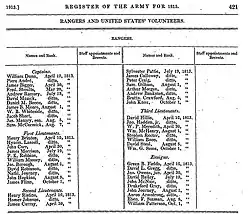 The 1812 Act authorized the President to raise up to six companies of rangers, either volunteers or men enlisted for a one-year period.[3] Two companies from Ohio, the rest from Kentucky, Indiana and Illinois.[1] In June, the secretary of war, William Eustis, reported that he had deployed the six companies at the frontiers of Ohio, Indiana, Illinois and Louisiana.[4] In July an additional company was authorized, and in February 1813 ten additional companies.[3][5][6] Four of the new companies to be raised in Indiana, three in Illinois, and three in Missouri.[7] Each company would consist of 1 captain, 1 first lieutenant, 1 second lieutenant, 1 ensign, 4 sergeants, 4 corporals, and 60 privates; the officers to be paid the same as the same grade in the army, the men $1 a day if furnishing a horse, otherwise $0.75.[3] No field officers (majors, lieutenant colonels, and colonels) or general officers were authorized or appointed.[8]