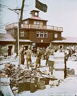 The United States military freed the prisoners of the concentration camps in Western Germany in April and May 1945, including Buchenwald, Dachau, Mittelbau-Dora, Flossenbürg, and Mauthausen concentration camps. Their complete liberation was not immediate, and significant numbers of survivors remained at the camps for months without adequate food, clothing or medical care.[25] For several months after their liberation, in accordance with official American military policy, a number of the camps continued to be heavily surrounded by barbed wire and guarded by armed American servicemen instructed to shoot escapees, as had the German guards that previously guarded the camps, though only two cases of such shooting have been documented.[25]