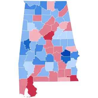 As of the 2024 presidential election, this is the last election in which Limestone County, Morgan County, Marshall County, Talladega County, Cullman County, Tallapoosa County, Bibb County, Randolph County, Henry County, Lamar County, and Clay County voted for a Democratic presidential candidate. This is also the most recent election where Alabama was more Democratic than the nation at-large and where Alabama voted left of several modern-day blue and purple states like California, Connecticut, Illinois, New Jersey, New York, and Pennsylvania.[1]