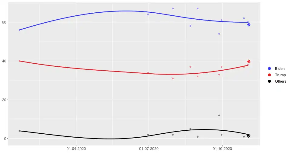 | 270 to Win[30] | October 5 – November 1, 2020 | November 3, 2020 | 57.5% | 35.5% | 7.0% | Biden +22.0 |