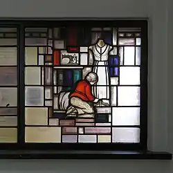 The building is built in an expressionistic professional style. The exterior is distinguishable by its use of bright yellow bricks and blue metal doors. The interior includes stained glass windows depicting various household skills such as cooking, washing and sewing.[6][7][8]