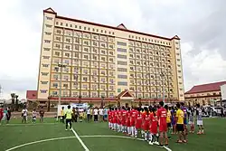 The University of Cambodia's 11-story main-campus building is smoke-free and handicapped-accessible and features elevators and ramps. The outside grounds hold a variety of local vegetation including palm trees,[39] car and motorbike parking, and a canteen.[40] The UC Sports Complex is located in the rear grounds and offers both a football (soccer) field and volleyball nets.[41] Welcoming visitors on the first floor is a statue of Samdech Preah Javaraman VII, King of Cambodia during the Angkor Era. On the 11th floor, there is a Coffee Today shop, copy and print center, and the UC Bookstore.