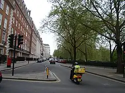 Much numbering is omitted due to the two very large buildings mentioned. This leaves numbers 6 to 23 that run from east to west, on the north side. No. 37 to No. 50 run in the opposite direction on the south side. Park Lane meets the street at about 2⁄3 of its length per its numbering (taken from its southern end) – immediately on the other side of the broad expanse of Park Lane (having a broken green central reservation) is Hyde Park, a few trees of which form the backdrop visible from the street, particularly the rise at the west end of the street.