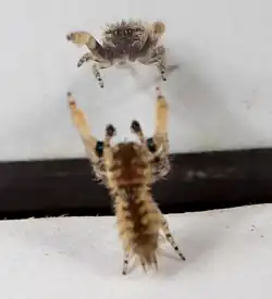 The male moves rather slowly, with long rest phases. It rarely jumps, and might escape by falling down on a thread of several centimeters, then climbing back up. When encountering a mirror, it displays to its male mirror image.