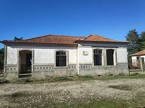 The complex consists of a passenger building (EP), a covered pier (CC), a sanitary facilities building (WC), staff accommodation buildings and a water tank. The passenger building has a polygonal floor plan and single-story façades, plastered and painted white, covered in stonework and ashlars of polychrome tiles. The main façade faces south and there are two panels of toponymic azulejos on the sides. The interior is divided into two zones with similar areas, the one to the east corresponding to the stationmaster's quarters, and the one to the west corresponding to the public area, with a waiting room and porch facing the line, and the service area, with telegraph office, ticket office and dispatch. The walls are covered in tiles with a polychrome pattern.