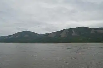 View of the western slopes of the range rising above the waters of the Lena.