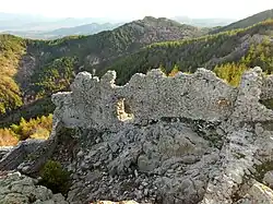 The fortress occupies an area of 1,290 m2 and has the shape of an open quadrangle resembling the of Cyrillic letter of "П".[1][2][4] It rises on an elongated, rocky, steep peak with very good visibility, covering a long distance in the surrounding area. The sheer cliffs to the north and northwest descend almost vertically. Far to the northeast there is visibility to another important castle in the region, Monyak.[3] Some 1.7 km northeast of Ustra are traces of another medieval fortress, part of the same fortification system.[9]