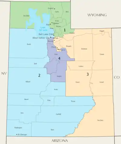 Utah is divided into 4 congressional districts, each represented by a member of the United States House of Representatives. After the 2010 census, Utah gained one House seat, and a new map was approved by the state legislature and signed into law by Governor Gary Herbert.[1][2]