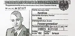 Between 5 April 1994 and 31 March 1995, Uwe Mundlos was a conscript in the German Bundeswehr.[1] There he continued his right-wing extremist activities and attracted attention for singing right-wing extremist songs, amongst other things. His company commander requested a disciplinary arrest of seven days, because Mundlos "carried a personal business card with the head of Adolf Hitler and a picture of his deputy Rudolf Hess". Mundlos was taken into custody, and officers searched his flat, finding 15 cassettes of right-wing extremist music and leaflets from the NPD.[7] However, in the opinion of the Truppendienstgerichts Süd in Kassel, this did not constitute "either a criminal offence or the elements of a service offence."[8] Mundlos was subsequently released.