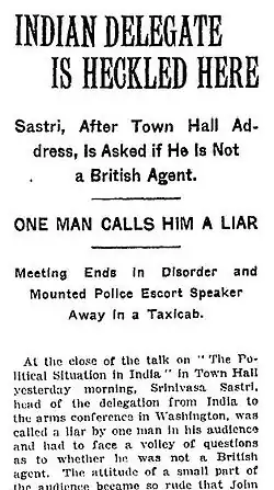 - ^ "INDIAN DELEGATE IS HECKLED HERE; Sastri, After Town Hall Address, Is Asked if He Is Not a British Agent. ONE MAN CALLS HIM A LIAR Meeting Ends in Disorder and Mounted Police Escort Speaker Away In a Taxicab" (PDF). The New York Times. 29 January 1922.