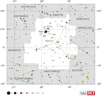 V500 Aquilae also known as Nova Aquilae 1943 was a nova which appeared in the constellation Aquila, very near the star Altair, in 1943. It was discovered by Cuno Hoffmeister on photographic plates taken at Sonneberg Observatory on 5 September 1943, when it had a photographic magnitude of 12.[4] It reached its peak brightness sometime between 13 April 1943 when it was fainter than photographic magnitude 13.5, and 2 May 1943 when its photographic magnitude was 6.55 (6.1 visual magnitude).[2]