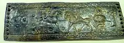 The belt-plate dates to the 5th century BC and is displayed at the Vienna Natural History Museum. It is 28.5 cm long and depicts five figures, four of which are warriors in combat. Two of the central warriors are on horseback.[1] These may be depictions of mythological events.[2]