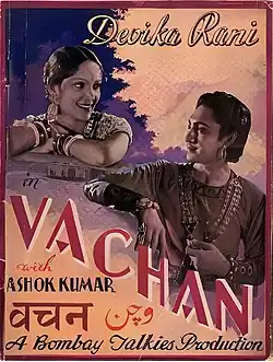 Vachan (Hindi: वचन, The Promise) is a 1938 costume drama Hindi film directed by Franz Osten.[1] The regular Bombay Talkies writer, Niranjan Pal, walked out of the Bombay Talkies production team after an altercation with Himanshu Rai in 1936. Saradindu Bandyopadhyay, a famous writer known also for creating Byomkesh Bakshi, replaced Pal in the story department, writing for films like Nirmala and Vachan in 1938 and Durga in 1939.[2] The screenplay was by Agha Jani Kashmiri, with dialogues and lyrics by J. S. Kashyap. The music was composed by Saraswati Devi aided by J. S. Kashyap.[3] The film starred Devika Rani and Ashok Kumar, a popular pair from Bombay Talkies who worked in seven films together. Devika Rani remained the bigger star with Kumar's name being "over-shadowed" in the credit rolls, as well as the publicity of the film.[4]