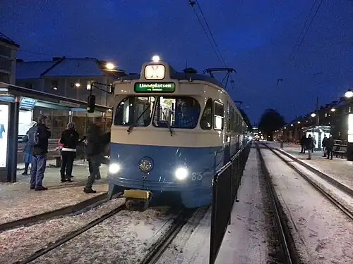 Vagnhallen Majorna is a Gothenburg tram network stop. It has two platforms with trees that separate the tram tracks from the road. It is one of the only two stations to have this structure; the other one is Ostindiegatan. Vagnhallen Majorna is an important tram stop because it is near the Vagnhallen Majorna where the tram stop depot is. There are many trams that use the tram stop.