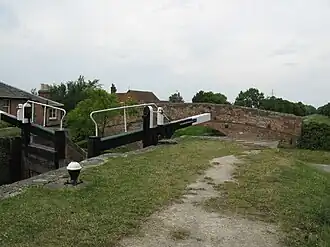 Woolsthorpe locks (on the Grantham Canal). The Rutland Arms public house (Dirty Duck) is in the background.