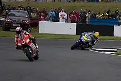 Rossi scored three pole positions in the next three races and finished second in France after battling with Gibernau, who overtook him on the last lap.[72][73] He won in Italy and came second again in Catalunya.[74][75] He took two third-place finishes in the Dutch and British rounds – the latter the result of a ten-second penalty for overtaking under yellow flags, which gifted victory to Max Biaggi in the process – and another second place in Germany, once again battling Gibernau who denied him victory with just 0.060 seconds separating both when they crossed the finish line after a titanic battle between the two.[76][77][78]
