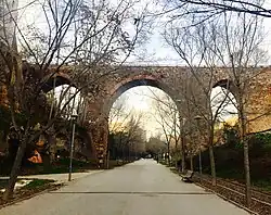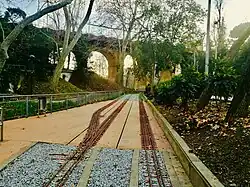 Further south, when the two torrents have already joined, is the longest bridge in the park: the Pont del Passeig. It is a bridge that connects the Vallparadís and the Cementerio Viejo neighborhoods. The construction of this bridge, in 1895, was the first intervention of the Public Improvement Plan of the City Council to divert the northern exit of Terrassa. It is 112 m long by 16.13 m high and is formed by six arches supported by frustum pilasters of ashlars with stone string courses. The entire intrados is made of brick and at the back there is a roadway for vehicles arranged in four lanes, as well as a sidewalk on each of the two sides. The bridge has undergone two extensions in 1960 and 1990 and is currently protected as a Bien Cultural de Interés Local.[30]