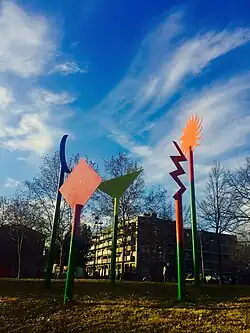 In the northern part of the park, at the access next to the 22 de Juliol walkway —between the Monner torrent and the Pla de la Font de l'Apotecari—, there is since 1999 the sculpture Relacions de l'espai by Àngel Màdico, a sculpture made up of five elements of different colors that contrast with the surroundings, depending on the position of the observer.[37][38] It consists of poles of more than three meters and at its end there are five different types of elements of nature and geometric shapes: the moon, the sun, the lightning bolt, a tyrangle and a rhombus in blue, yellow, red, green and pink colors, respectively.[38] According to the author, the whole is an alloy of elements that contrast between nature itself and abstraction. This contrast is chosen so that the observer creates his own composition depending on the point of view in which he is with the possibility of altering it by changing its position. The sculpture of naïve character is one of the references of the users of the park.[38]