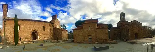 Panoramic view of the monumental complex of the churches of Sant Pere with the church of Sant Pere on the left, the church of Sant Miquel in the center and the church of Santa Maria on the right.
