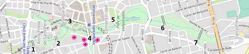 • In the southern area, Santa Eulàlia Avenue crosses the park through the Pont del Cementiri Vell. This avenue is also identified as the N-150, which corresponds to the road that connects the C-16 highway, west of Terrassa, with the C-17 highway in Montcada i Reixac.