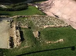 It is a series of buildings with an existence of more than 1500 years that were restored in the late 19th century. Later, in 1906, an archaeological search was carried out on the site by the architect Josep Puig i Cadafalch. This exploration resulted in one of the most important elements for the historiographical evaluation of the diocese of Egara, documented from the year 400 to 750.[14] The complex, which encompasses both the late and early medieval periods,[14] was built on a small hill on both sides of the Vallparadís and Monner torrents that make up the park, at a time when Christianity went from being a tolerated religion to an official one.[15] At first, a basilica was built, and later a cathedral, in the area currently occupied by the church of Santa Maria and the clergy house. In this construction, which lasted more than a century, a funerary shrine with a subway crypt was also built, which today is the church of Sant Miquel. In this area, tombs have been found facing east,[note 3] belonging to the necropolis of the Episcopal period of the 11th century and the Carolingian period of the 9th and 10th centuries.[15] During this period a parish church was also built, which corresponds to the church of Sant Pere and the episcopal palace next to the cathedral.[15]