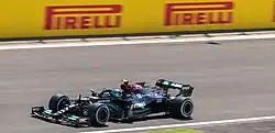 Both Mercedes cars struggled for pace during the wet Turkish Grand Prix qualifying session, with Bottas qualifying ninth. The rain continued during the race and Bottas spun six times after damaging his front wing due to contact with the Renault of Esteban Ocon, finishing a lap behind race-winner Hamilton in 14th place.[151] This gave Hamilton an unassailable 110-point lead over Bottas in the Drivers' Championship, securing Hamilton his seventh world title.[152] At the Bahrain Grand Prix, Bottas qualified second before suffering a puncture during an early safety car period, resulting in an eighth-place finish.[153] He was joined by George Russell at Mercedes for the Sakhir Grand Prix as Hamilton was unable to race, and took pole position ahead of Russell by 0.026 seconds.[154] Bottas was overtaken by Russell on the opening lap. A tyre mix-up later in the race dropped both cars down the order, with Bottas being sent into and out of the pits without a tyre change. He lost positions in the closing laps to cars on fresher tyres and finished eighth.[155] At the season-ending Abu Dhabi Grand Prix, Bottas qualified and finished second ahead of Hamilton.[156]