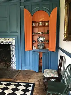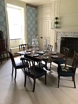 The dining room is in the eastern wing, separated from the eastern parlor by the rear hall,[189] and is designed in a late-18th-century style. It was likely not originally used for meals, as Americans generally did not have dedicated dining rooms prior to the American Revolution.[180] The dining room had a fireplace with a mantel from c. 1800,[170] which had ornamentation such as pilasters, sunbursts, and motifs of one-quarter of a fan.[180] There was a small closet built into the side of the fireplace mantel, which was used to keep items warm during winters. One corner of the room also featured a large white cupboard which was used to store porcelain.[190] The walls are made of light plaster above dark buff wainscoting, and a chimney occupies the north wall. Atop the wall was a ceiling molding, which likely dated from the 19th century.[180] An 18th-century ceiling molding and fireplace mantel were restored in a subsequent renovation.[191]