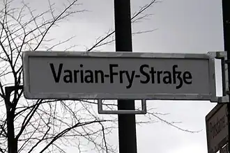 - 2005 - A street in the newly reconstructed East/West Berlin Wall area in the Berlin borough of Mitte at Potsdamer Platz was named Varian-Fry-Straße in recognition of his work.[61]