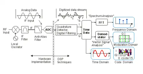 Vector signal analyzers are useful in measuring and demodulating digitally modulated signals like W-CDMA, LTE, and WLAN.[1] These measurements are used to determine the quality of modulation and can be used for design validation and compliance testing of electronic devices.