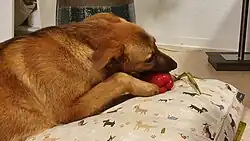 A mutt eating a bell pepper