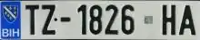 Bosnia and Herzegovina vehicle registration plates have held their current form since 2 February 1998.[1] Currently the Bosnia and Herzegovina (BiH) vehicle registration plate format consists of seven characters: five numbers and two letters arranged in the following order: X00-X-000 (taxis: TA-000000). The plates are uniform across the country and do not denote the place (town, municipality, canton, or entity) where the vehicle is registered, as was the case prior to 1998. Likewise the plates do not contain any heraldic symbols. The plates use only letters which are represented equally in Latin and Cyrillic script (A, E, O, J, K, M, T).