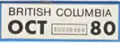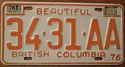 1976 Orange on white Beautiful British Columbia 12-34-AB 00-00-AA to approximately 25-00-DS Letters I, O, Q, U and Z not used in serials; this practice continues today.[9]