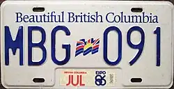 1985 Blue on reflective white with screened stylized provincial flag used as separator Beautiful British Columbia 1234 AB 0000 MB to 9999 YY; 0000 AA to approximately 9999 LR