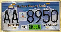 Passenger 2007 Screened mountain design background with black lettering and the 2010 Winter Olympics logo in the centre The Best Place On Earth 123 MBC 000 MAA to 999 MJF Issued from April 16, 2007 to December 31, 2010. Surcharge supported Canada's Winter Olympic team.[12]