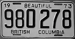 1973–78 Blue on white Beautiful British Columbia ABC 123 LAA 000 to XKK 999; LLA 000 to XXK 999; LLL 000 to PXX 999 Later plates manufactured in Quebec using that province's serial dies.