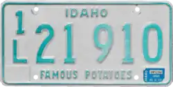 1982–85 | Embossed green serial on white plate; "IDAHO" screened in green centered at top, with the 'A' resembling a mountain peak | "Famous Potatoes" screened in green centered at bottom | Serials in each county continued from where the 1974–82 plates left off. | ||