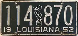 1952 | Embossed white serial with pelican separator on dark green plate with border line; "19 LOUISIANA 52" at bottom | none | 123-456 | 1-001 to approximately 590-000 | |